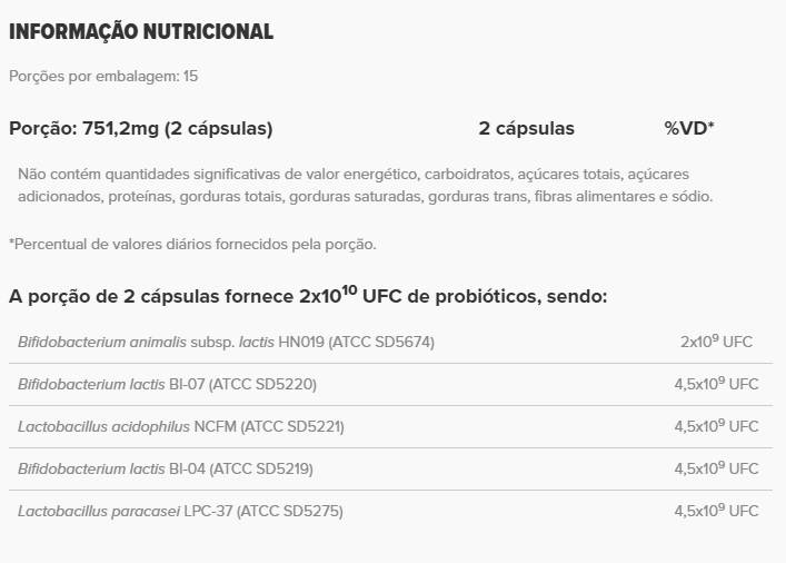 Probiótico com 20 bilhões de microrganismos vivos por dose em um blend que reúne 2 espécies de lactobacilos e 3 espécies de bifidobactérias para contribuir com a saúde do trato gastrointestinal.
