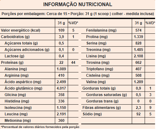 Diluir uma porção de 31g (1 scoop) em 200ml de água = 22g de proteína. Ingerir uma porção ao dia ou conforme orientação de um profissional da saúde.